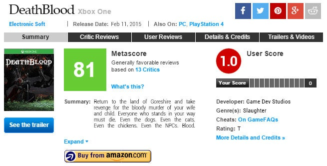 February 10 - DeathBlood’s review embargo expires. Every (other) major video game site on Earth publishes their verdict of the game simultaneously. DeathBlood receives largely positive reviews (general complaints being that the game was “short on content and even shorter on new ideas”), earning a Metacritic rating of 81%. Its user rating, however, stands at 1.0 (out of a possible ten), fans complaining about everything from the state of multiplayer servers to feminist critiques in reviews to the spelling of the game’s name.
